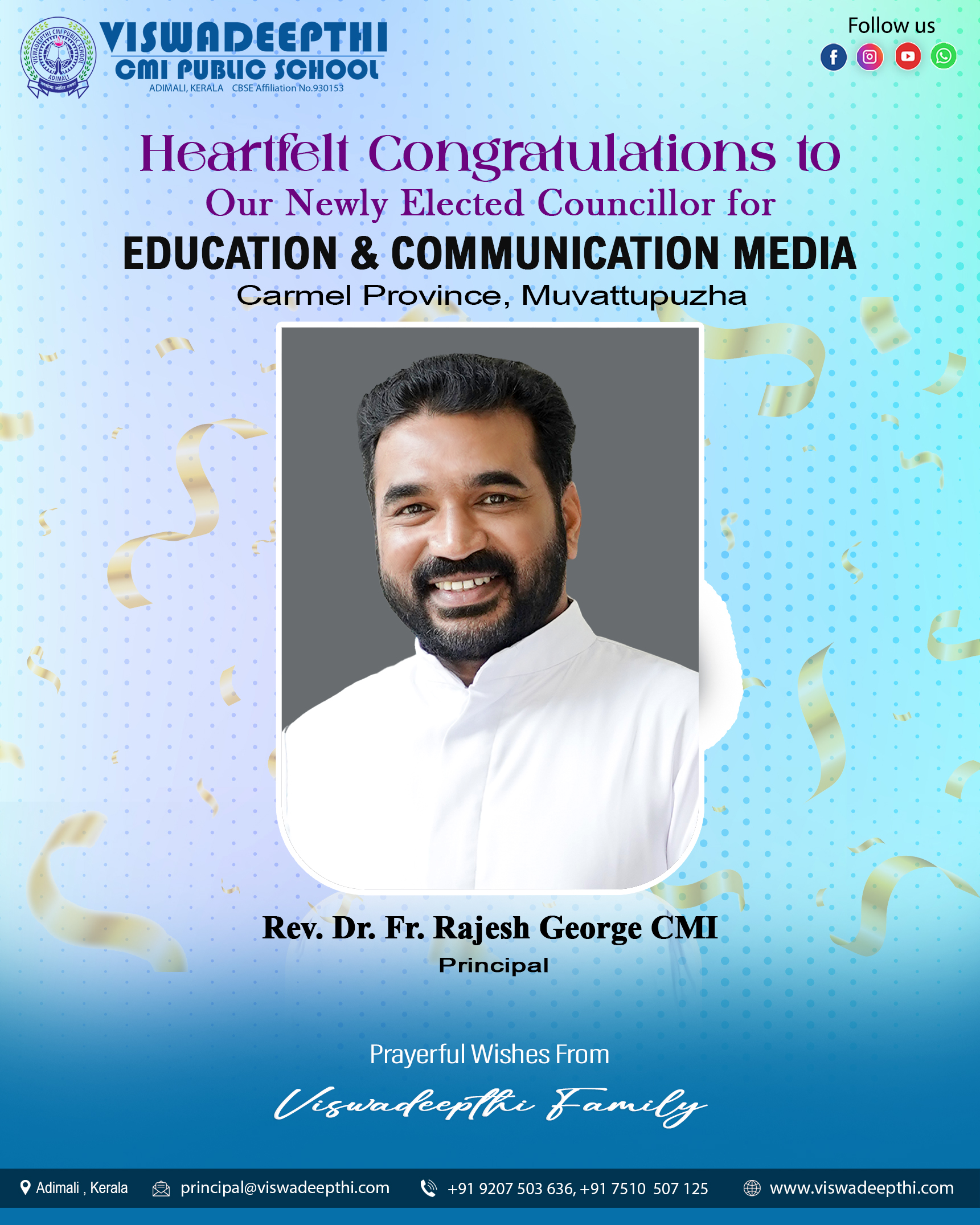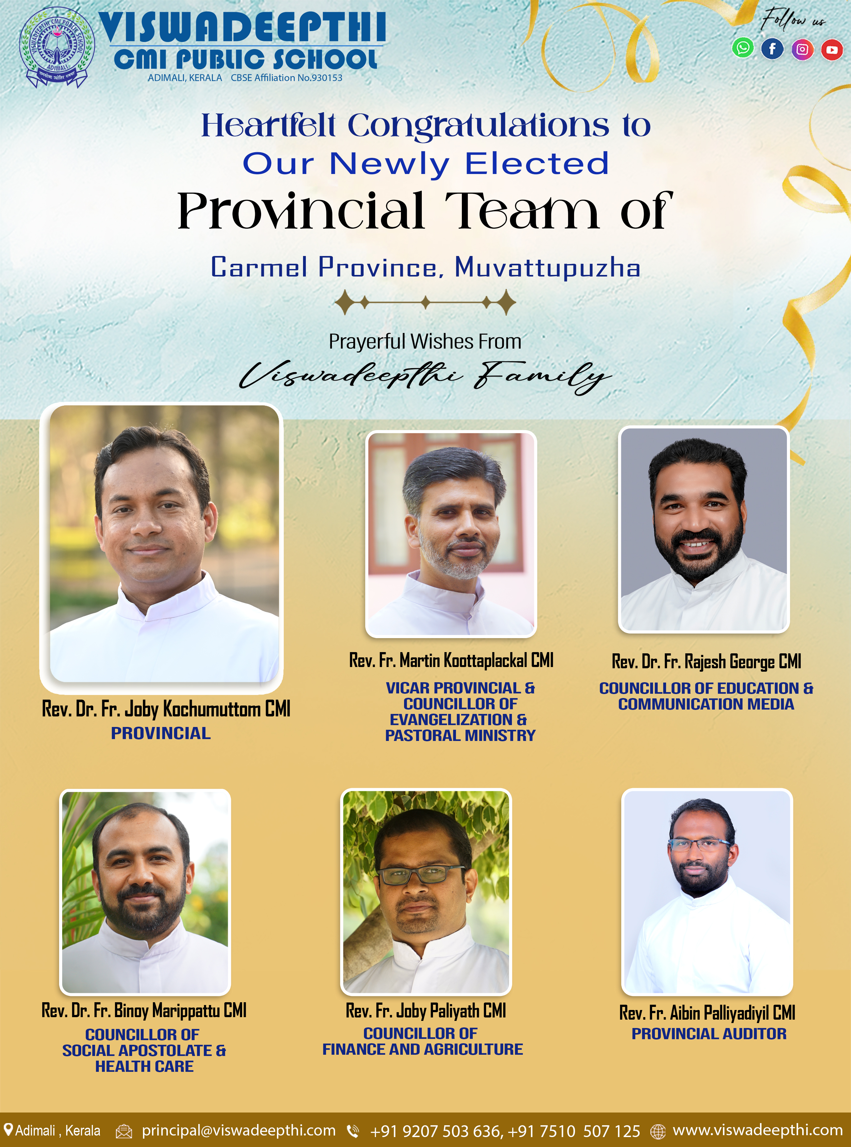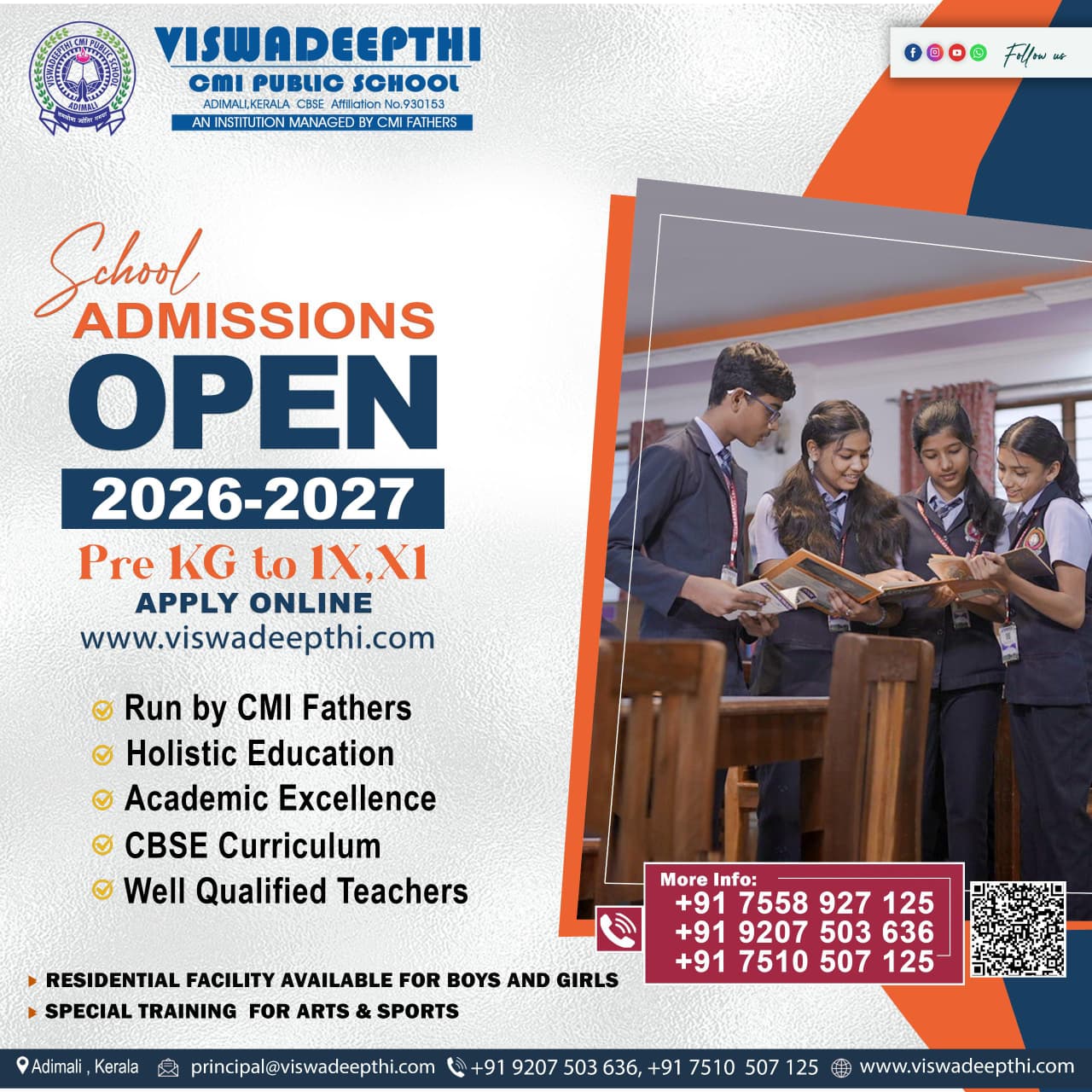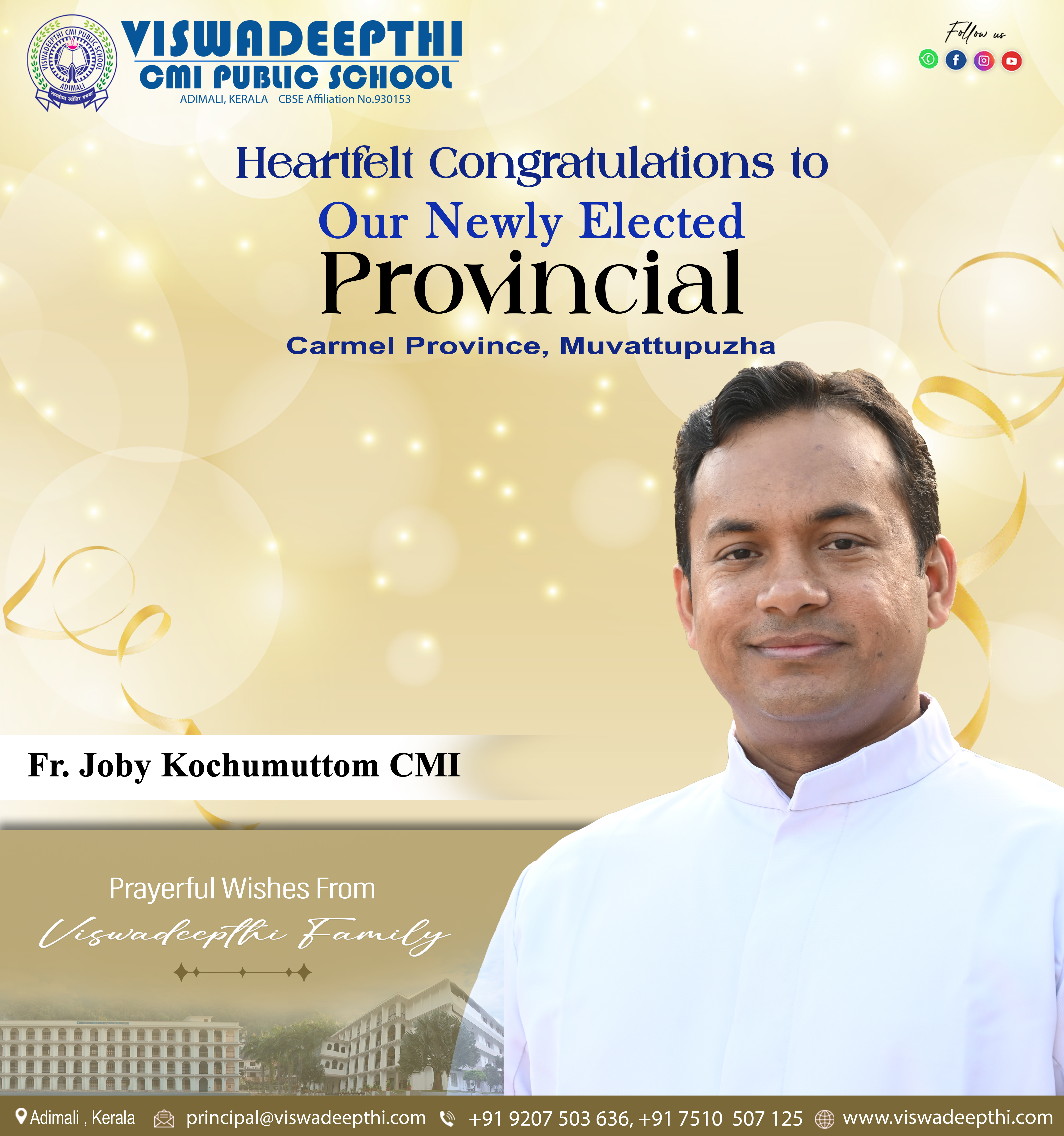 Envisioned and established by the Fathers of the Carmel Province of the Carmelites of Mary Immaculate (CMI), Viswadeepthi Public School is a co-educational institution, following the CBSE syllabus. This minority institution, run by CMI Fathers of Carmel Province, Muvattupuzha, was the realization of the long cherished dream for quality education of the people in and around Adimali. Set in a serene atmosphere, Viswadeepthi Public School is an artistically designed edifice, equipped and provided with ample facilities for work, play and recreation. Manned by a team of professionally trained, competent, devoted and dedicated teachers under the overall supervision of the CMI Fathers, the school really is an extension of their homes.